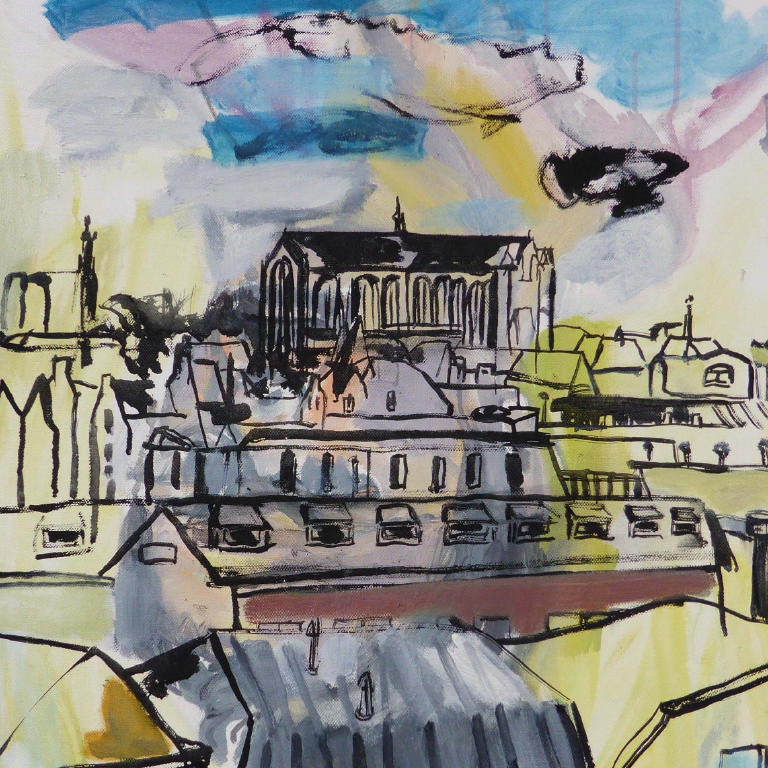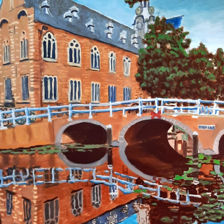 Suzanne's kleurrijke stadsgezichten van o.a Leiden zijn gemaakt met verschillende teken en schildertechnieken. Ze gebruikt o.a. acrylverf, waterverf, potlood en maakt het op de computer af waardoor het uiteindelijk digitale kunst is.