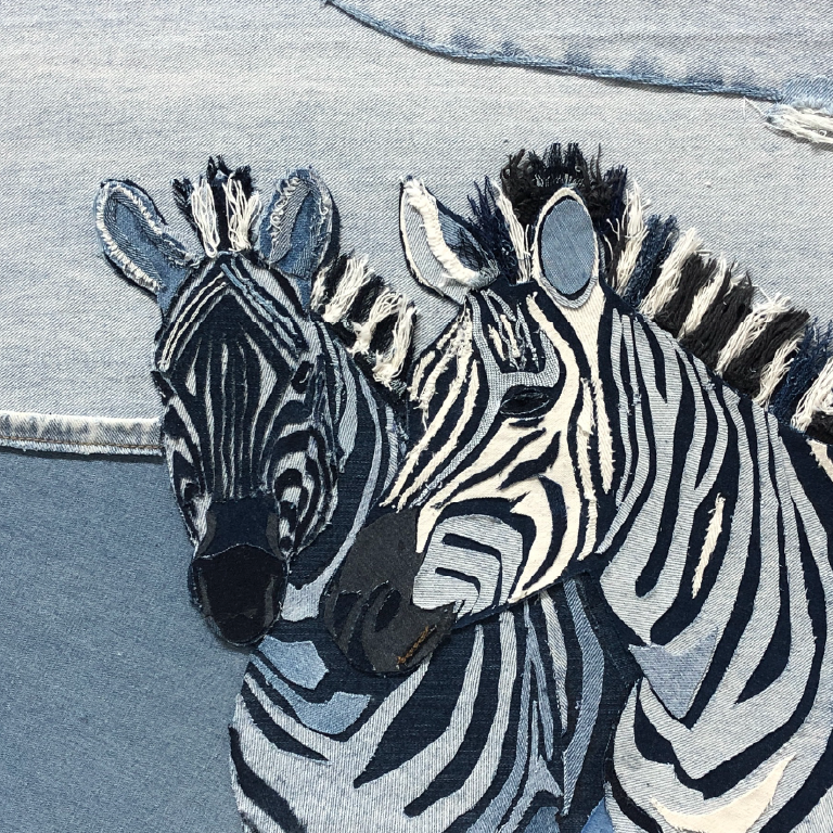 In de collages van denim van Lisete Hogewoning worden alle stukken van de spijkerbroeken in laagjes geplakt. De jeans verdwijnt volledig in het kunstwerk. De geborduurde versieringen, knopen, ritsen en etiketten worden, indien nodig, allemaal gebruikt in het kunstwerk. De verschillende nuances in het blauw van de broek worden gebruikt voor licht- en schaduweffecten.
