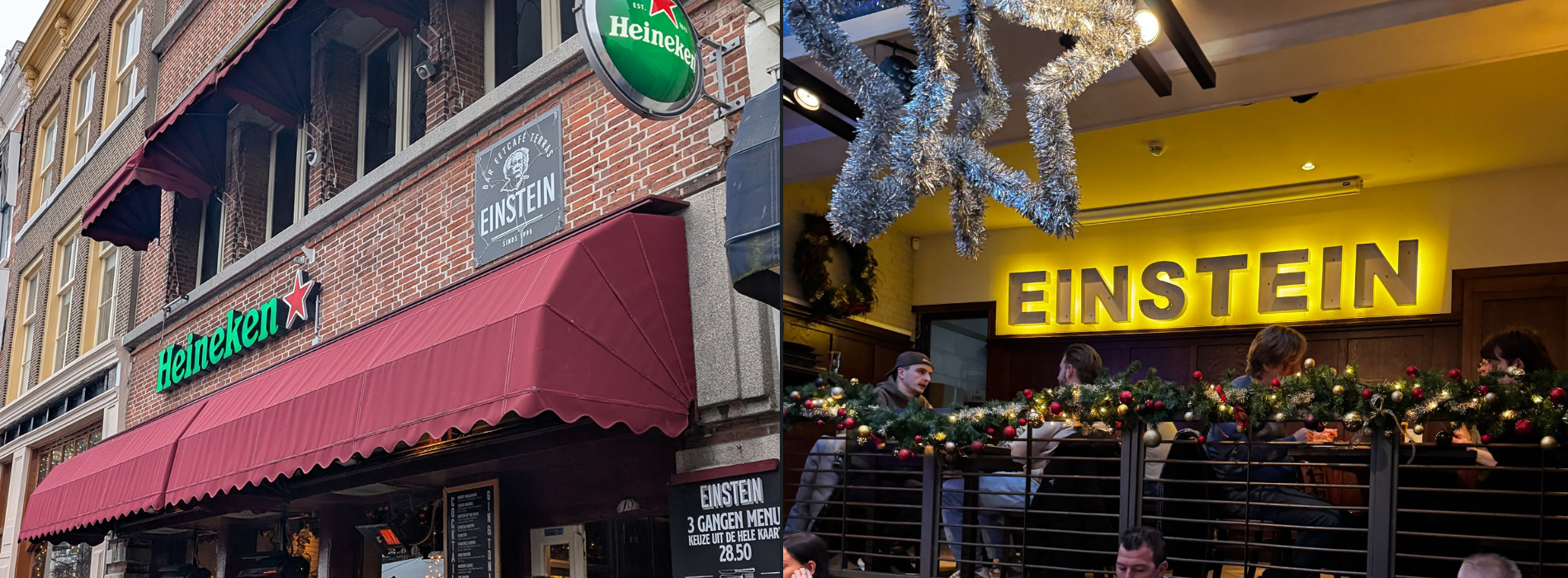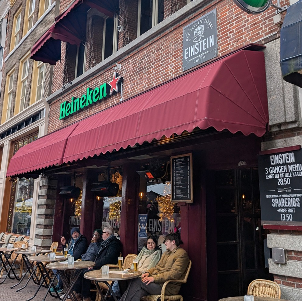 Zonder veel discussie stonden we daarom bij Einstein voor de deur. Al jarenlang een vaste waarde aan de Nieuwe Rijn. Een plek die bij vrijwel iedereen bekend is en waar maar weinig mensen nooit een hapje of drankje hebben gedaan.